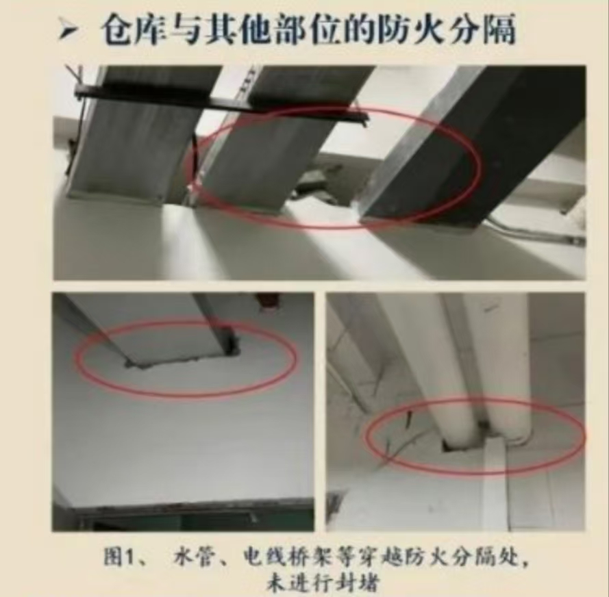 建筑内设置的两类仓库与其他部位之间的防火隔墙上存在孔洞、封堵不完整或封堵材料的燃烧性能等级和隔墙耐火极限均不符合消防规范要求。
