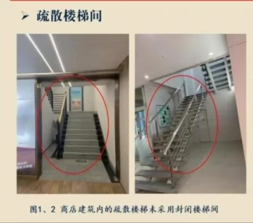 建筑内新增或改建的疏散楼梯设置形式不符合规范要求,应采用封闭楼梯间的场所,现场采用敞开楼梯间或敞开楼梯。