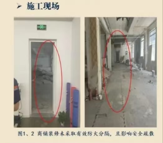 施工现场未设置消防安全警示标志,施工部位与其他部位之间没有采取有效防火分隔措施,影响使用区域的安全疏散。