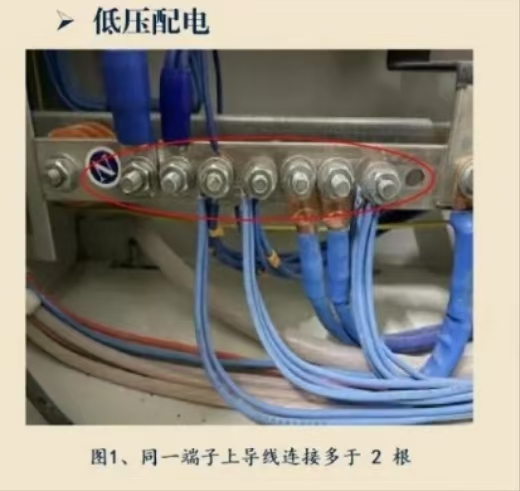 衣据《建筑电气工程施工质量验收规范》第5.1.12.1条之规定,同一端子上导线连接不多于2根,防松垫圈等零件齐全。