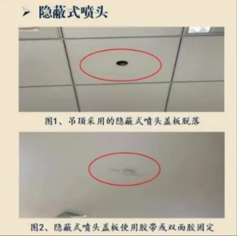 吊顶采用的隐蔽式喷头盖板脱落或是为了防止脱落使用胶带或双面胶固定,影响喷头盖板在火灾时受热感应和脱落,会导致喷头无法喷水灭火。