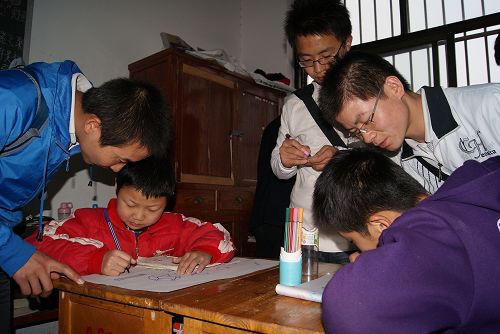 书法与绘画组的志愿者们或手拿毛笔或手握彩笔,与小朋友们在洁白的纸上书写、绘画;或歪扭或工整的字体在志愿者大朋友与小朋友的笑脸中就是世间最美丽的文字;一幅幅或可爱或纯真的动漫画作、风景画在大手与小手的共同描绘下就是人间最美的画作。