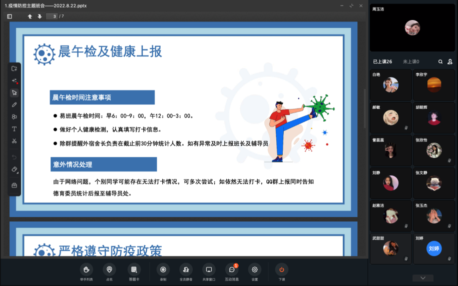 八月炎炎盛夏,疫情来势汹汹,近期国内疫情多点暴发,商洛市出现新一轮突发疫情。为积极响应政府及公司号召,确保员工安全健康,加强思想教育和价值引领,BB贝博艾弗森于8月23日借助钉钉会议、班级QQ群、微信群等对1390名在校生开展“你我同心协力,共筑疫情防线”主题教育“云”班会,就当前疫情防控形式、公司疫情防控要求等进行宣传教育。