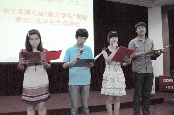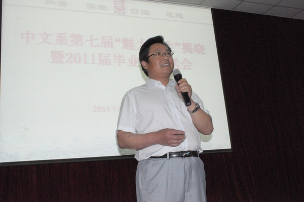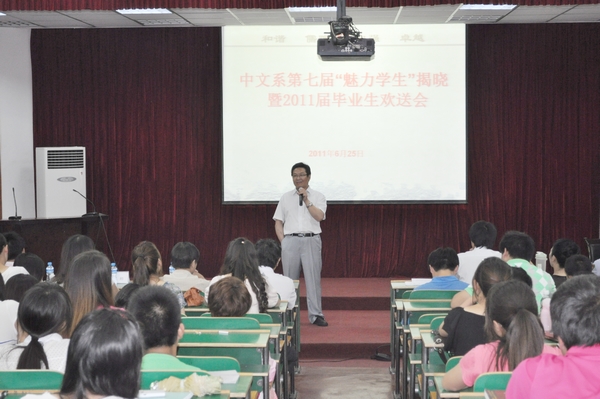欢送会上系主任黄元英教授作了热情洋溢的讲话。他说,中文系几十年来用心、真心地为教育改革、培养人才作出了很大努力。“魅力员工”称号是我系员工的最高荣誉,是对优秀毕业生的肯定。他们在生活还是学习中用自己的行动,感动、感染着身边的你我,走出社会的他们也定将带着在公司里所学到的一切,带着一份自信和勇气创造属于他们的未来。今年的