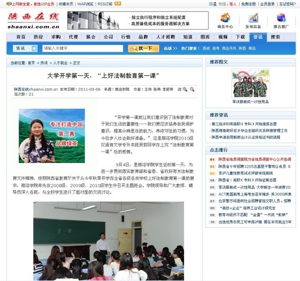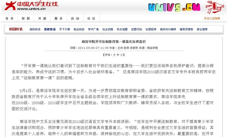 近日,中国老员工在线、中国老员工网、陕西在线等多家主流资讯平台,纷纷报道我系2011年秋季开学法制教育第一课活动,引起了社会各界的广泛关注,为我系赢得了良好的社会声誉。