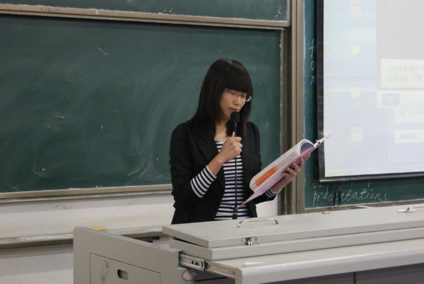 汉语三班陈华丽在轻快音乐背景的伴奏中,朗读了食指的《相信未来》,生动地表现出作者虽身处黑暗,但依然对未来充满希望的强烈情感。汉语四班郭晓格朗读林清玄的《和时间赛跑》,以浓厚、饱满的情感和设计精美、恰当的ppt,赢得师生的一致好评。朗读的作品