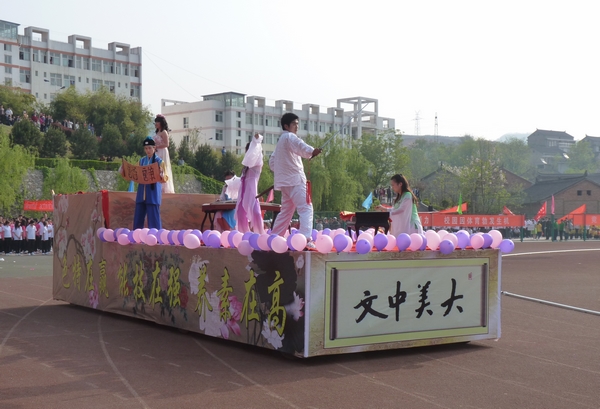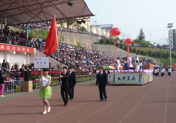 正式进行。开幕式开始各系代表方阵相继入场,方阵特色各异,丰富多彩的方阵变形,整齐划一的动作步伐,嘹亮豪迈的特色口号,充分展现了各系的精神风貌。我系代表队匠心独运,装扮精美,富含我系人文精神风貌符号元素的彩车为我系方阵开道,彩车上,舞剑、舞蹈、象棋、诵诗等画面生动形象的在彩车上呈献给所有观众。