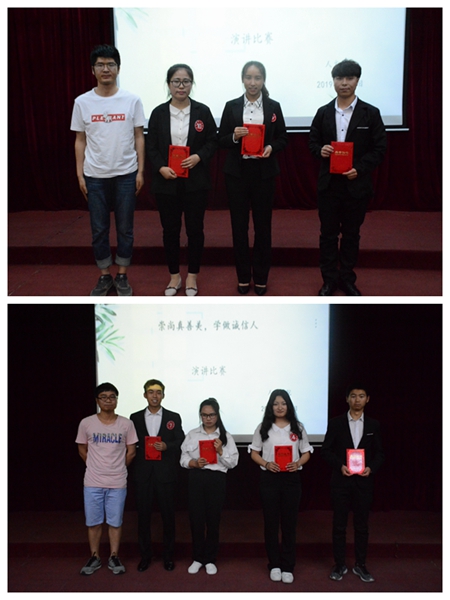 经过激烈的比拼,汉语1802班陈兴斩获一等奖;汉语1803班王燕飞、汉语1821班刘毓菁荣获二等奖;汉语1805班李静、汉语1802班王浩、汉语1821班张宝莹获得三等奖;网媒1801班苗玉菲、网媒1801班陈奇宇、汉语1802班聂光艳、汉语1703班王朝旭获得优秀奖。评委为获奖者颁发了证书并合影留念。