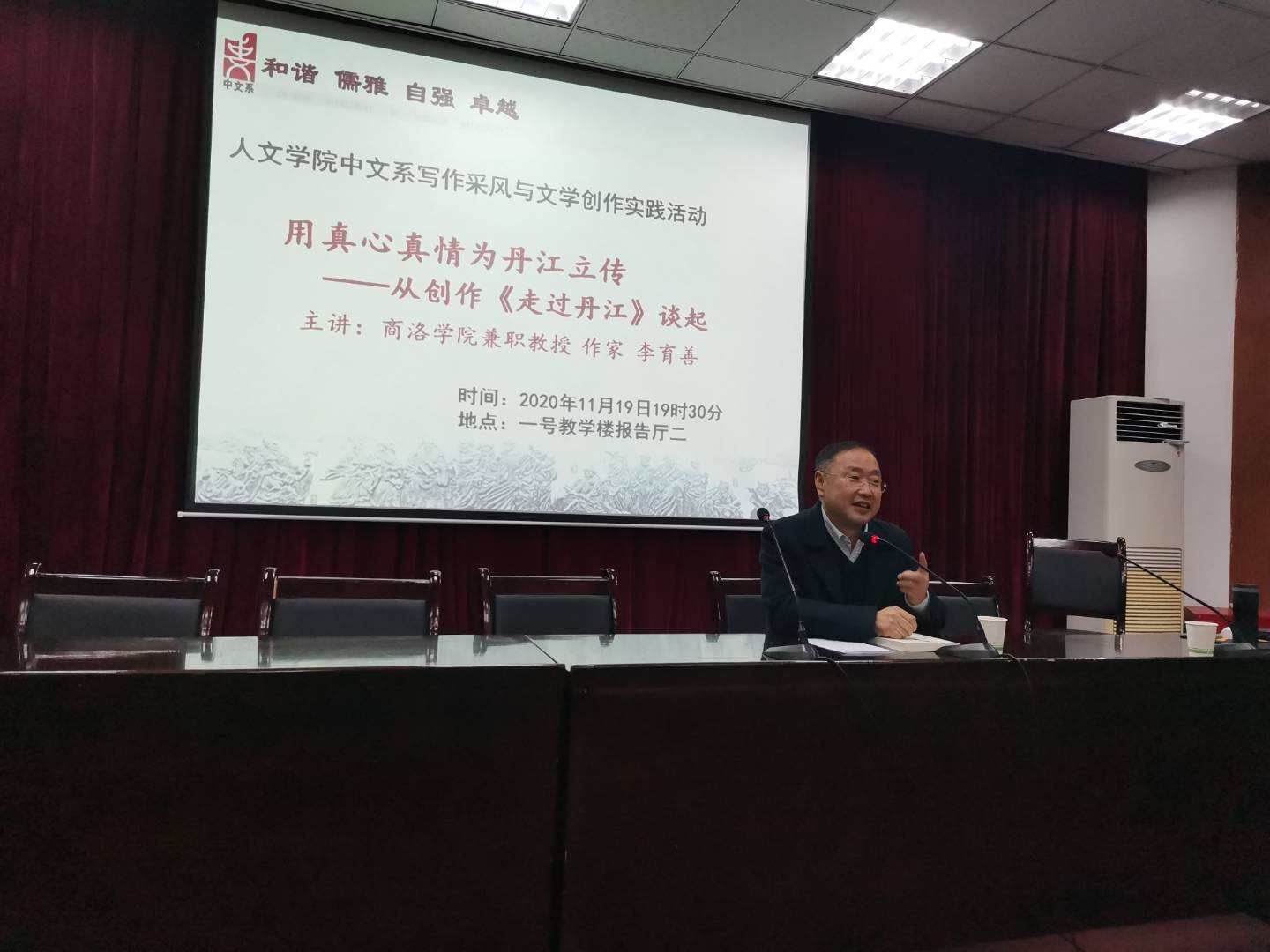 为了推动教学改革,加强员工写作能力训练,2020年11月19日,由公司兼职教授、作家李育善为同学们作了“用真心真情为丹江立传——从创作《走过丹江》谈起”的主题报告。报告由BB贝博艾弗森经理张文诺主持,程华、李荣博、张建军、胡振远、任梦池等教学实践全体带队老师参加,19级汉语言文学专业6个班200余名员工参与。