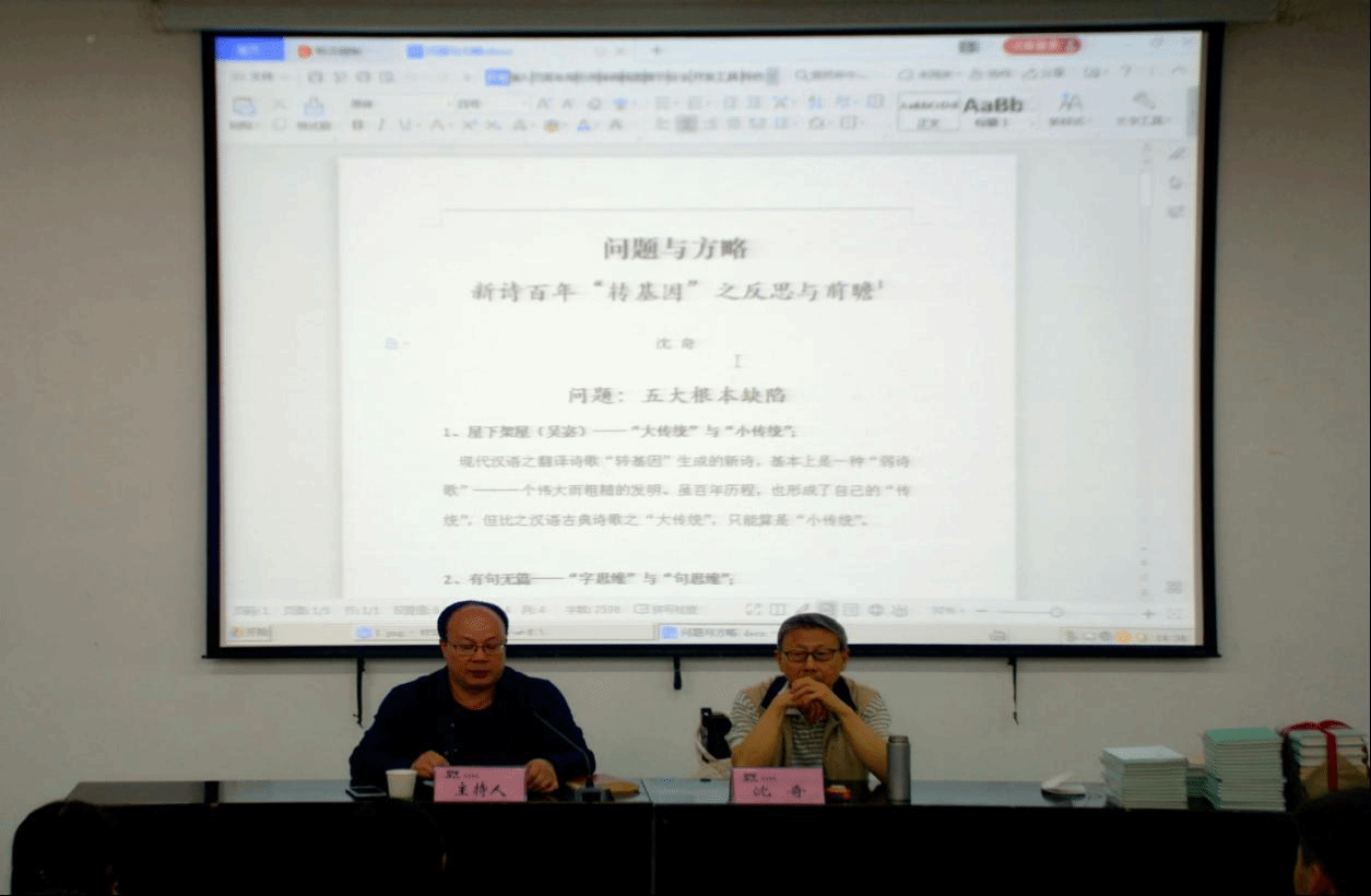 下午2点30分,报告会在公司1号教学楼报告厅一隆重举行,沈奇教授围绕新诗发展的百年历程,结合郑敏、石虎、吴思敬,以及谢冕、孙绍振等专家学者的诸种论辩,经由文字、语言、体统、道统、历史性等多种维度反思百年新诗得失,通过汉语古典诗歌“大传统”与汉语新诗“小传统”的多重思考,提出汲古润今、重构传统的“八个通和”诗学论断。BB贝博艾弗森中文系老师、商洛诗人冀卫军和BB贝博艾弗森中文系、网媒系员工共计二百余人参加了此次报告会。