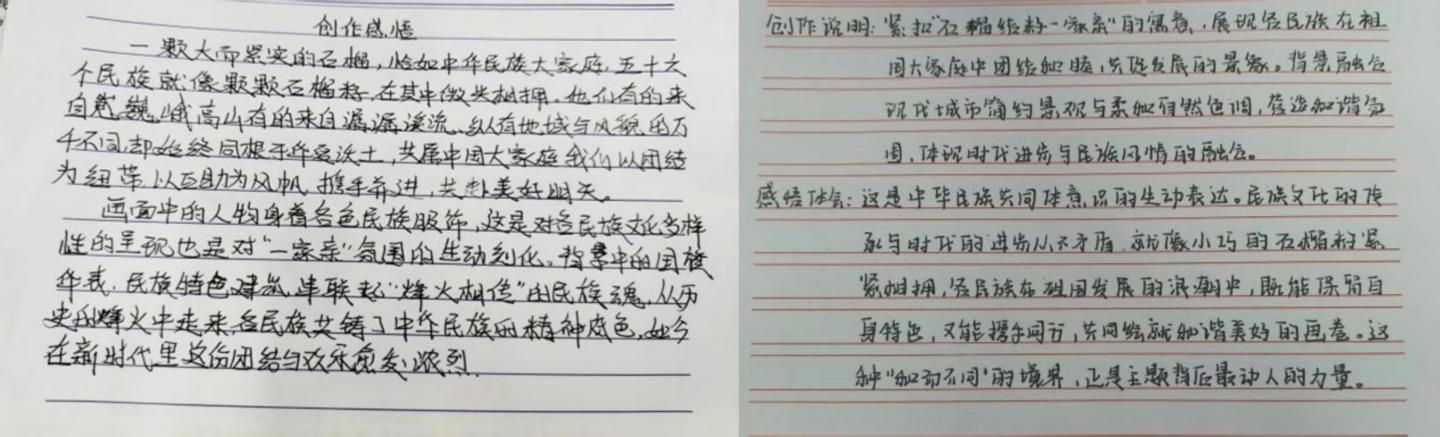 团总支、员工会举办“AI 聚力·共绘民族同心圆”创意比赛,鼓励2025级员工运用多样化的艺术形式,表达对民族团结的理解。同学们书法作品笔力遒劲,挥毫泼墨间书写着“民族团结一家亲”的坚定信念;图文并茂的手抄报和创意剪贴画,生动呈现了各民族文化的丰富多样与交融互鉴,借助生成式人工智能APP,同学们将个人思考呈现为一幅幅既充满现代科技感又不失艺术魅力的画作,为传统艺术创作注入了新鲜活力。