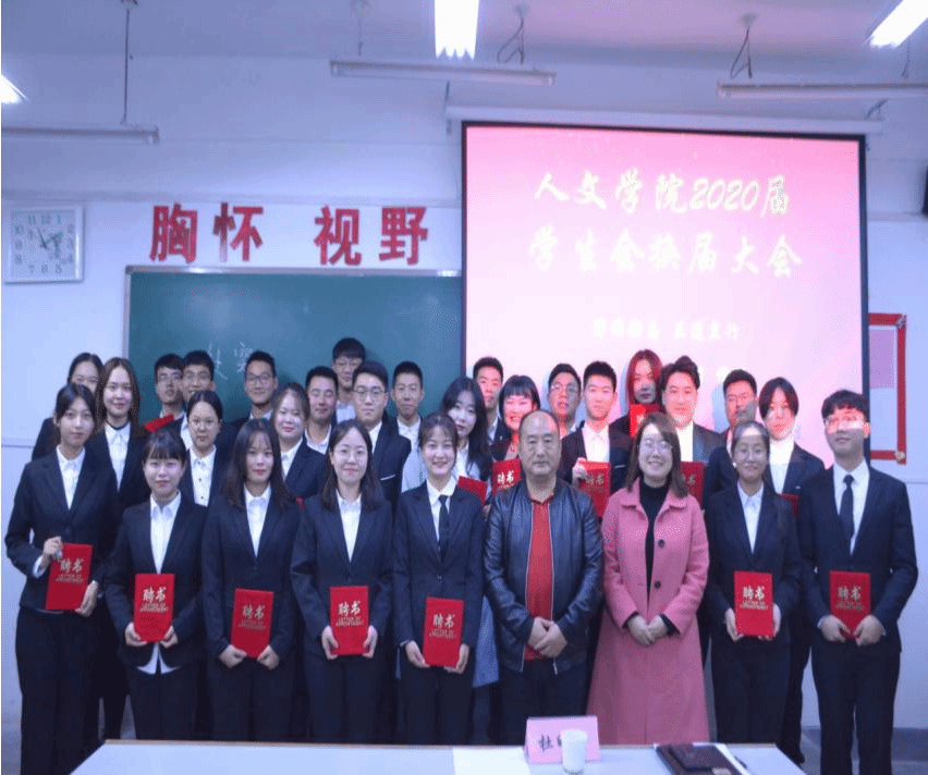 党总支副书记杜明生、团总支书记李丹阳为2019届全体员工会成员颁发聘书并合照。